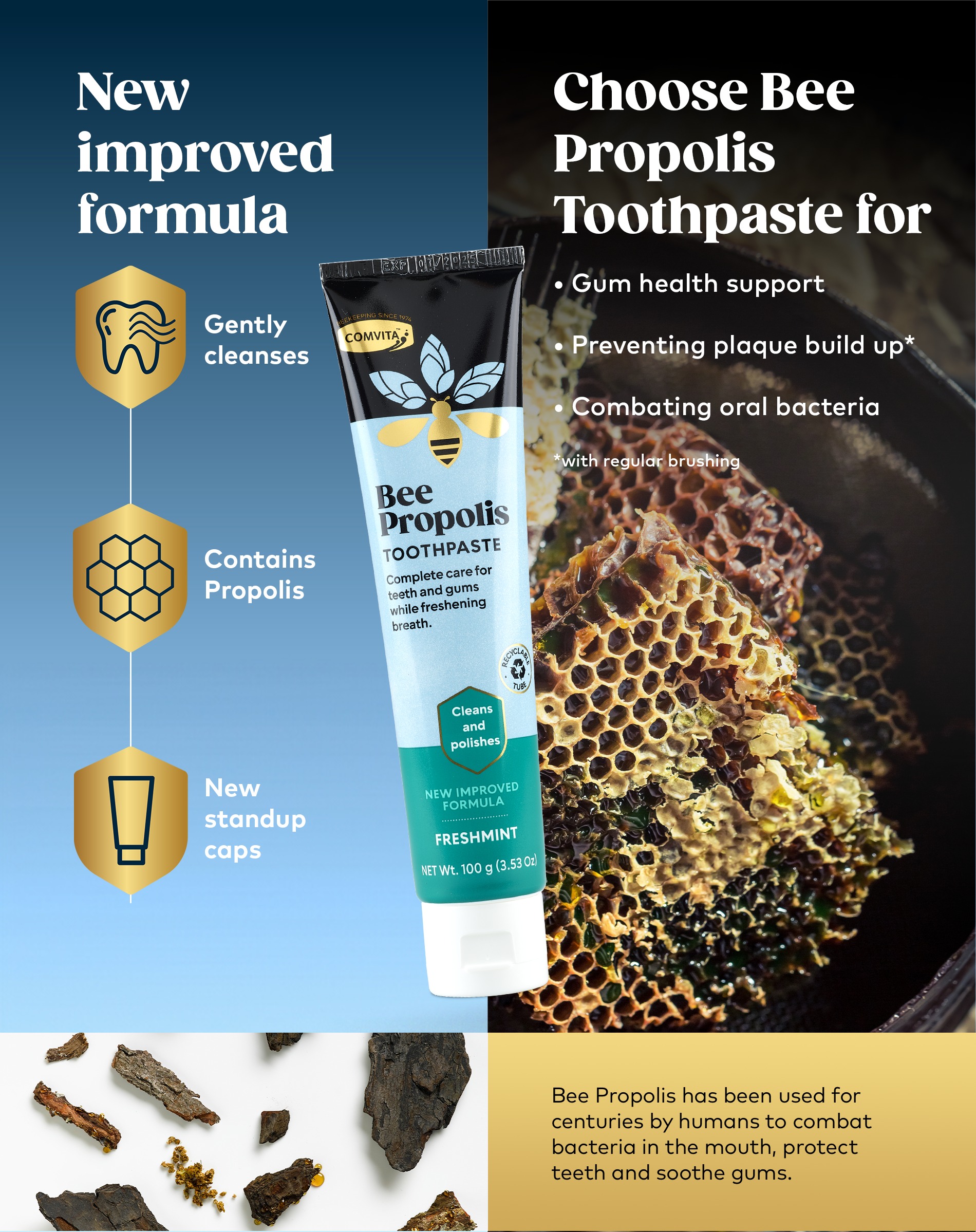 Hãy trải nghiệm sự tự tin và cảm giác tươi mới với nụ cười của bạn, nhờ vào những công dụng tuyệt vời của sản phẩm chăm sóc răng miệng Comvita Propolis Toothpaste mang lại.