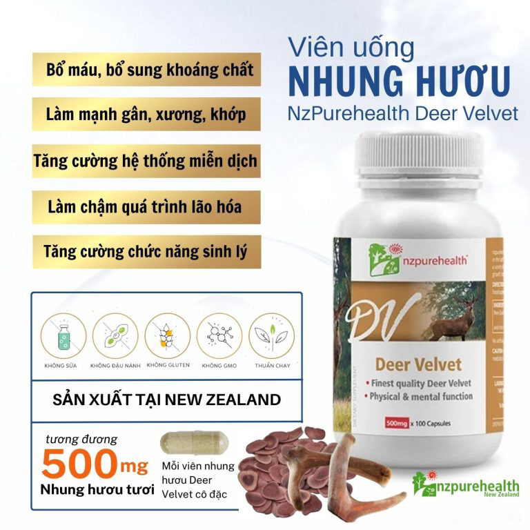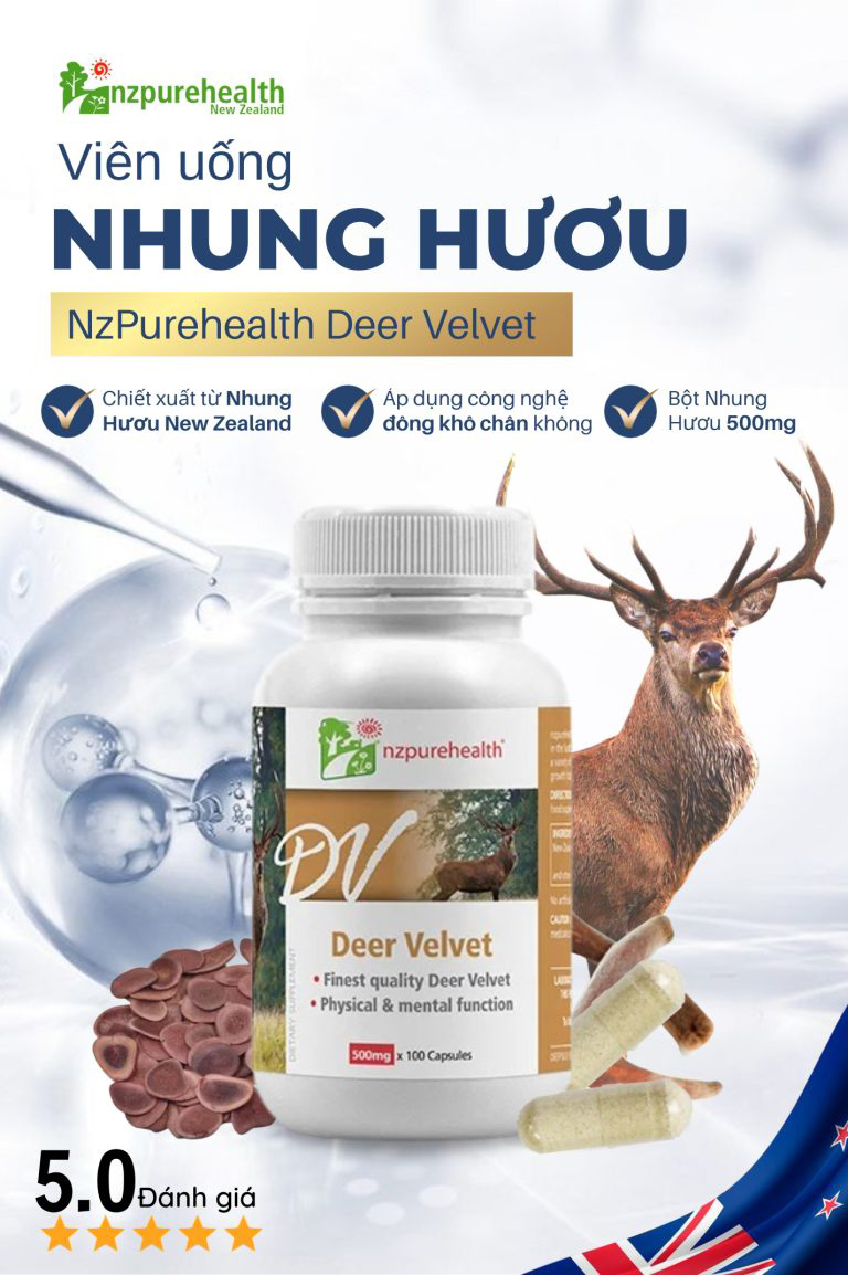 Nhung hươu của Viên uống nhung hươu Deer Velvet của Nzpurehealth được lấy từ những con hươu tốt nhất sống trên đỉnh núi cao, nằm trên đảo Nam của New Zealand. Các nhà khoa học đã phát hiện ra rằng trong Nhung hươu có chứa một loạt các yếu tố phức tạp, bao gồm các axit amin, enzyme, khoáng chất, vitamin, chất béo, hoóc môn nam và nữ và leuteinizing hormone, một hormone kích thích tăng trưởng rất mạnh gọi như IFG-1.